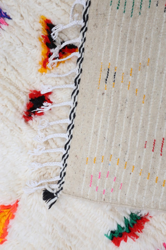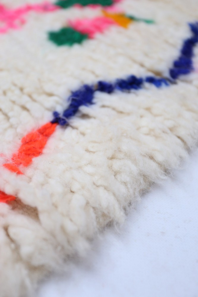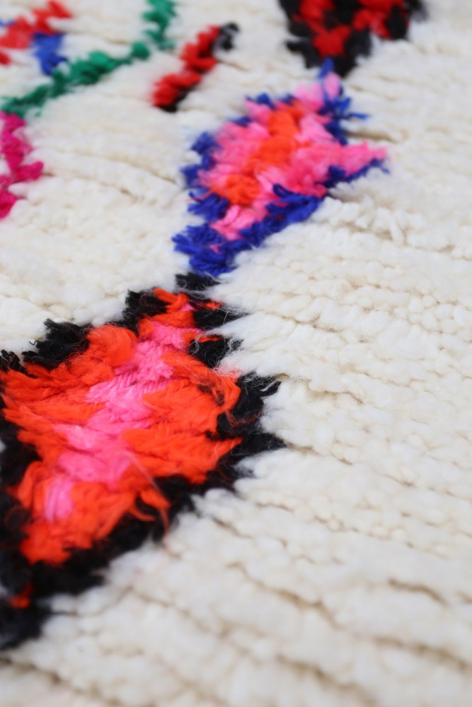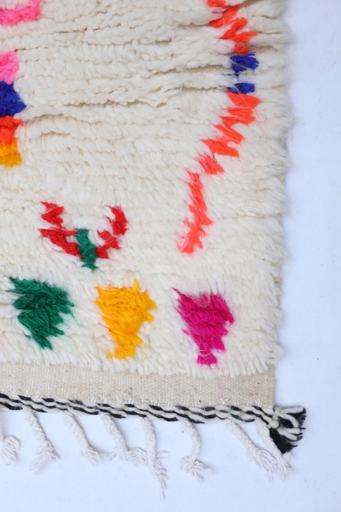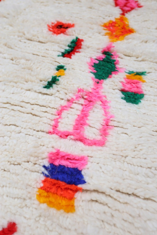 Der helle cremefarbene Hintergrund wird durch lebendige Farben wie Pink, Rot, Gelb, Blau und Grün ergänzt. Die farbenfrohen geometrischen Muster machen diesen Azilal Teppich zu einem echten Blickfang und verleihen jedem Raum eine warme und stilvolle Atmosphäre.